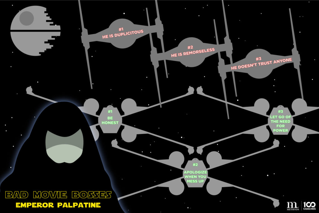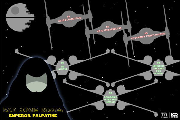 For the third installment in our bad boss series, we’re examining perhaps one of the biggest baddies of them all (in terms of scale): Emperor Palpatine from the Star Wars franchise. Those familiar with the series will recognize him as epitomizing the Dark Side of the Force and being the mastermind behind almost all of the decades-spanning dramatic tension in the franchise. Those unfamiliar only need to know one thing: he is an evil incarnate.